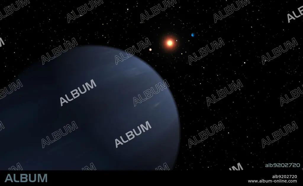 Caption: This artist's concept shows four of the five planets that orbit 55 Cancri, a star much like our own. The most recently discovered planet, and the fourth out from the star, looms large in the foreground. It is at least 45 times the mass of Earth, or half the mass of Saturn, and it orbits the star every 260 days. The system's three known inner planets can be seen in the background around the glowing star, while its most distant planet is not pictured. Fifty-five Cancri has produced a larger number of massive planets than our solar system. The colors of the planets in this illustration were chosen to resemble those of our own solar system. Astronomers do not know what the planets look like.