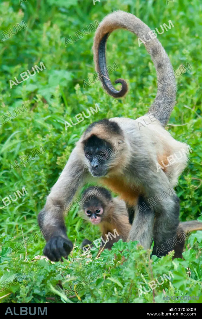 Adult and young Geoffroy's Spider Monkey (Ateles geoffroyi), also known as the Black-handed Spider Monkey, an endangered species native to Central America.