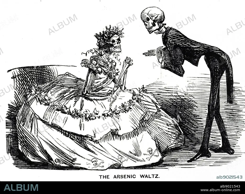 Cartoon titled "The Arsenic Waltz" which comments on the deadly use of arsenic in fashion and beauty products. Dated 19th century