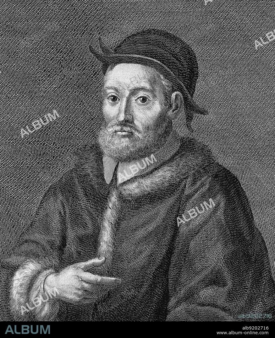 Caption: Andrea Cesalpino (1519 - 1603), Italian physician, philosopher and botanist. His De plantis libri XVI (1583) is considered the first textbook on botany, a discipline he helped found. Line engraving by F. Allegrini after Giuseppe Zocchi, 1765.