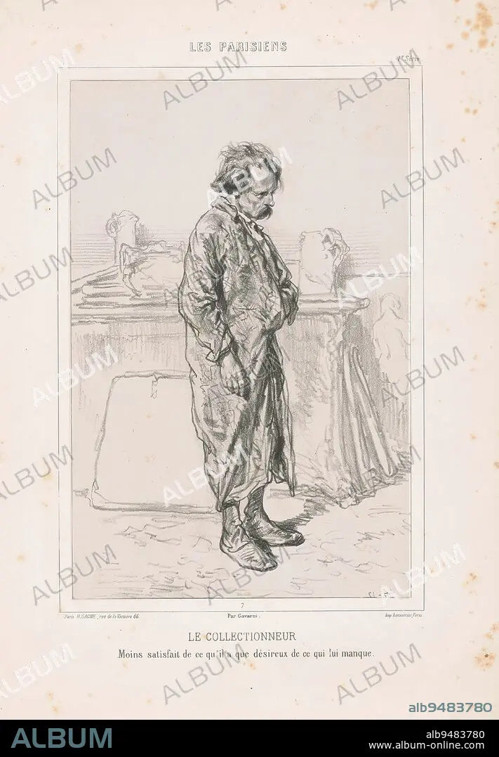 Collector, Le collectionneur (title on object), Parisians (series title), Les Parisiens (series title on object), print maker: Paul Gavarni, (mentioned on object), printer: Joseph Rose Lemercier, publisher: Henry Gache, Paris, 1857, Material, height 445 mm × width 312 mm