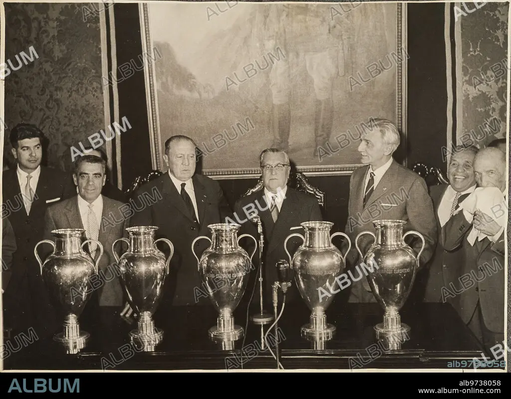 Madrid, 05/23/1960. Presentation at the Casa de la Villa of the five European Cups won by Real Madrid. In the image, General Joaquin Agulla Jiménez, Santiago Bernabéu, Enrique Díaz Guijarro, José Antonio Elola Olaso and General Ricardo Villalba Rubio