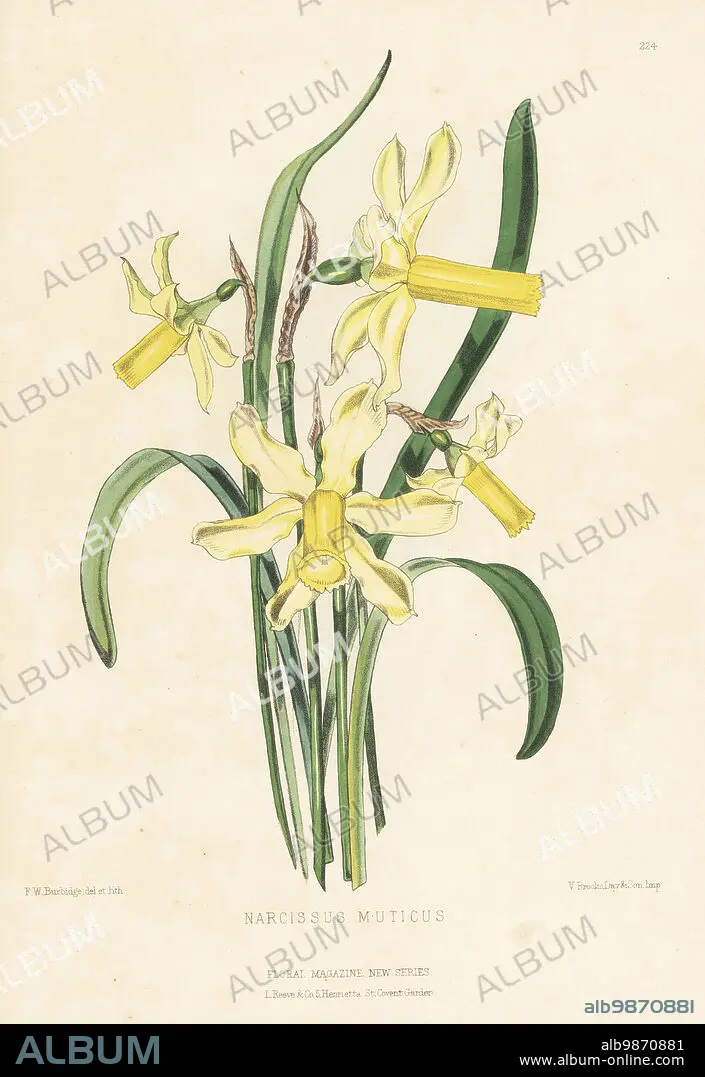 Caption: Daffodil species, Narcissus abscissus, native to France and Spain in the Pyrenees. As Narcissus muticus. Handcolored botanical illustration drawn and lithographed by Frederick William Burbidge from Henry Honywood Dombrain's Floral Magazine, New Series, Volume 5, L. Reeve, London, 1876. Lithograph printed by Vincent Brooks, Day & Son.