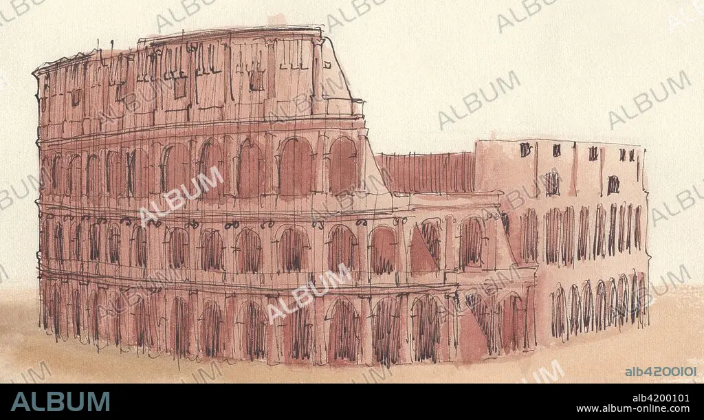 Caption: The Pantheon, Rome, Italy, 1951. 'Roman architecture - The Pantheon, Rome - AD 120-124. Section and view of interior: Eye, Portico and Rotunda'. The Pantheon, a former Roman temple, now a church, in Rome, Italy, is circular and consists of a porico and rotunda under the world's largest unreinforced concrete dome, with a central opening (oculus) to the sky. Shirley Markham (1931-1999) studied Graphic Design and Illustration at Central School of Art in London from 1950-1952. The writer, artist, poet, and illustrator Mervyn Peake (1911-1968) was one of her tutors, and her style of drawing was also influenced by other British illustrators such as Edward Ardizzone, Quentin Blake and Edward Bawden. Markham spent time in the Dolomite Mountains in Italy, and also visited Rome, sketching classical buildings. After graduating from Central, she worked as a graphic designer, producing book illustrations, cartoons for comics, menus and programmes. She gave up her promising career however when she got married in 1957. Middle-class women at that time were expected to devote their energies to bringing up children and running the home, and despite her obvious talent, she lacked the confidence to return to illustration. Her portfolio remained in the family attic for many years, but now her work is published here for the first time.