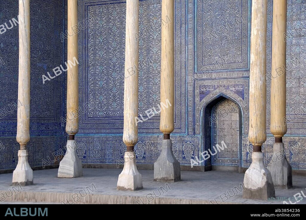 Wooden columns at wall decorated with fine blue maiolica Ko'xna Ark Itchan Kala Khiva Uzbekistan