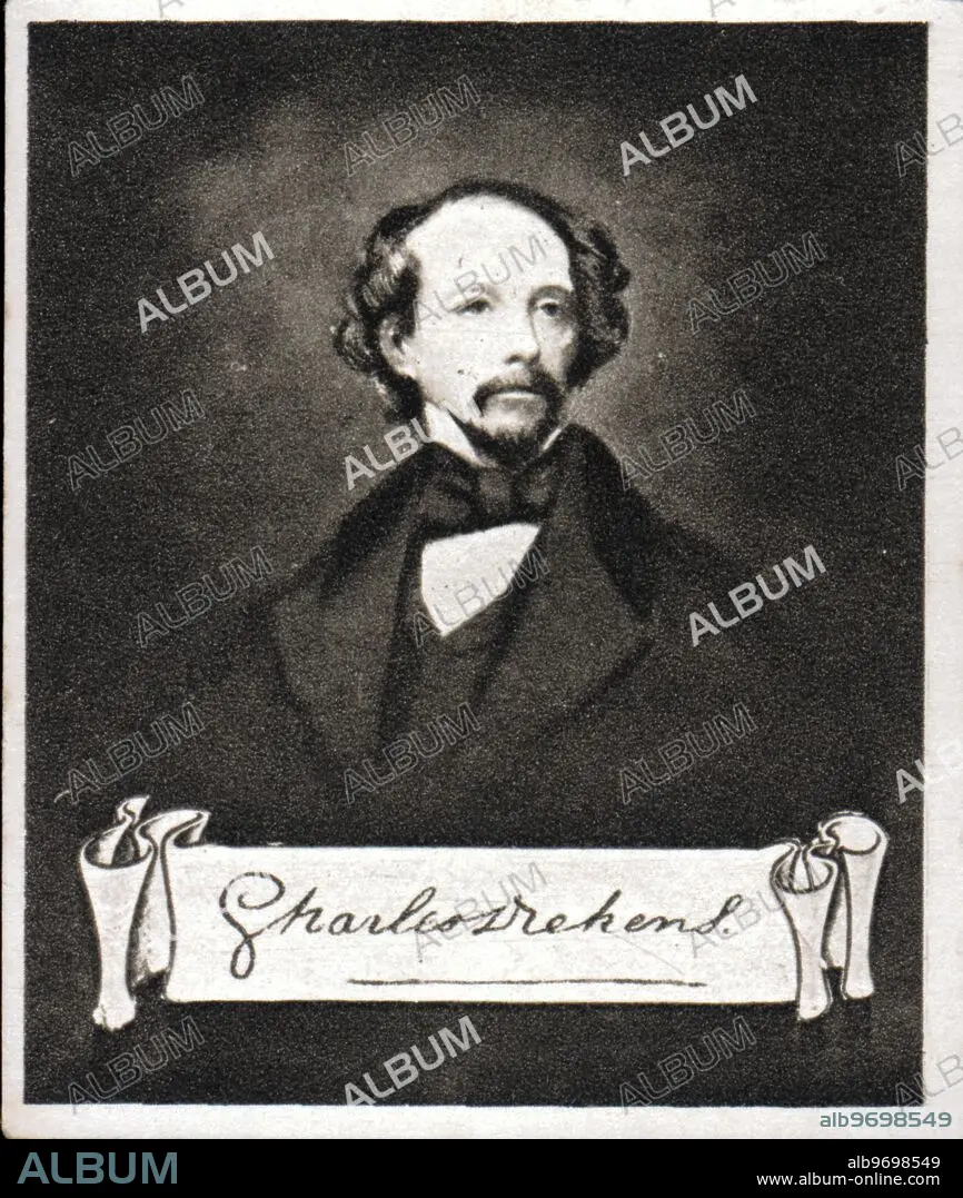 CHARLES DICKENS. From the original at the National Portrait Gallery - Painting by Aryscheffer. 1855. His original signature can be seen in the Guildhall Library, London, on a letter written by him to Samuel Phelps, 29th August 1847, on his performance of Cymbeline, Saddlers Wells Theatre. Born at Landport, Portsea, 1812. Died at Gadshill, Rochester, 1870. First worked in a blacking factory at 6s. per week. Became reporter for the Press in the House of Commons. In 1836 issued "Sketches by Boz" and married daughter of George Hogarth. Wrote "Pickwick Papers"; also "Oliver Twist" as a serial. Editor of the Daily News 1846. Author of many celebrated books. With a strong sense of justice the abuses which he exposed brought about many reforms particularly in Poor Law Administration. He was buried in Westminster Abbey.