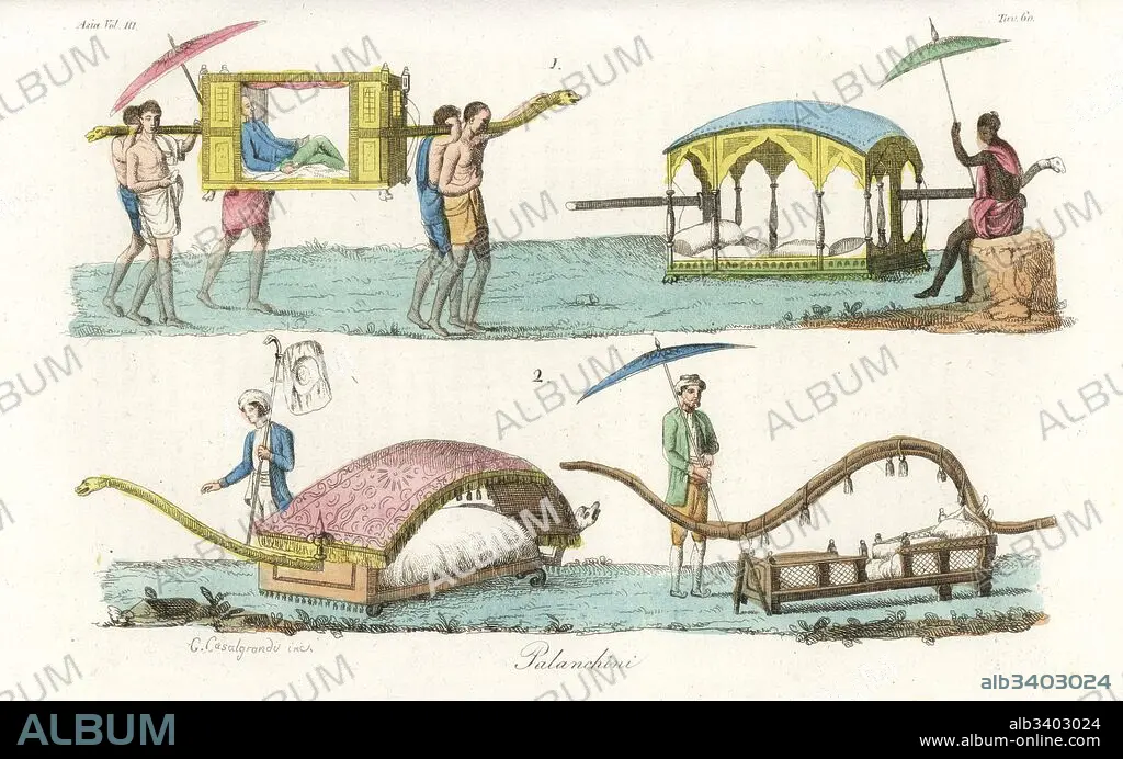 Caption: Indian transport: sedan chair or palanquins. Long palanquin, miyana, jhalidar palki, and copala palki. Handcoloured copperplate drawn and engraved by Andrea Bernieri after Francois Solvyns from Giulio Ferrario's Ancient and Modern Costumes of all the Peoples of the World, Florence, Italy, 1844.