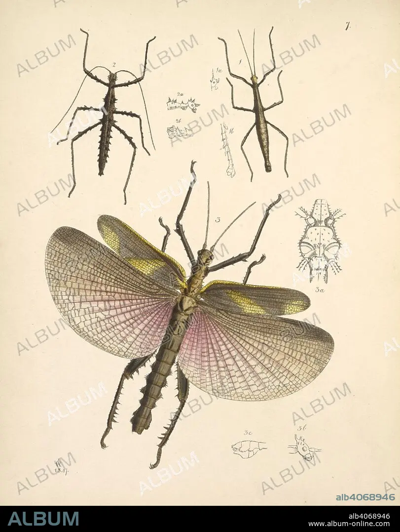 Caption: Orthoptera is an order of insects with paurometabolous or incomplete metamorphosis, including the grasshoppers, crickets, cave crickets, Jerusalem crickets, katydids, weta, lubber, Acrida, and locusts. (ORDER— ORTHOPTERA. Section— Ambulatoiiia. Family— Piiasmid.e.) FIGURE 1: PHASMA (ACANTHODERA) SEMI-ARMATA. FIGURE 2: PHASMA (ACANTHODERA) BICOROXATA. . The Cabinet of Oriental Entomology; being a selection of some of the rarer and more beautiful species of Insects, natives of India and the adjacent islands. London, 1848. Source: 1258.k.17 plate 7.