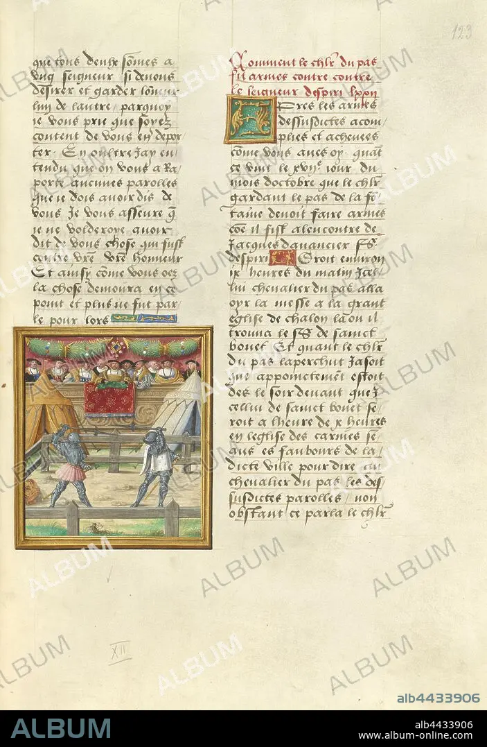 Caption: Jacques de Lalaing Fighting the Lord of Espiry at the Passage of Arms of the Fountain of Tears, Master of the Getty Lalaing (Flemish, active about 1530), Belgium, about 1530, Tempera colors, gold leaf, gold paint, and ink, Leaf: 36.4 × 26.2 cm (14 5/16 × 10 5/16 in.)