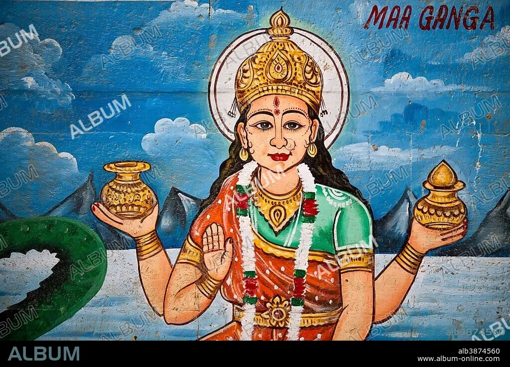 Caption: Mother Goddess Ganga painted on the wall of a house on the banks of the Ganges River, Varanasi, Uttar Pradesh, India, Asia
