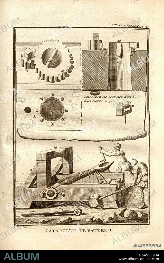 Caption: Battery catapult, Catapult, signed: M. Pool sculp, Pl. XXX, Tom., II. Page 233, after p. 232, Pool, M. (sculp.), 1774, Polybius; Vincent Thuillier; Jean Charles de Folard: Histoire de Polybe. Tome 2; Amsterdam: Arkstée et Merkus, MDCCLXXIV [1774]