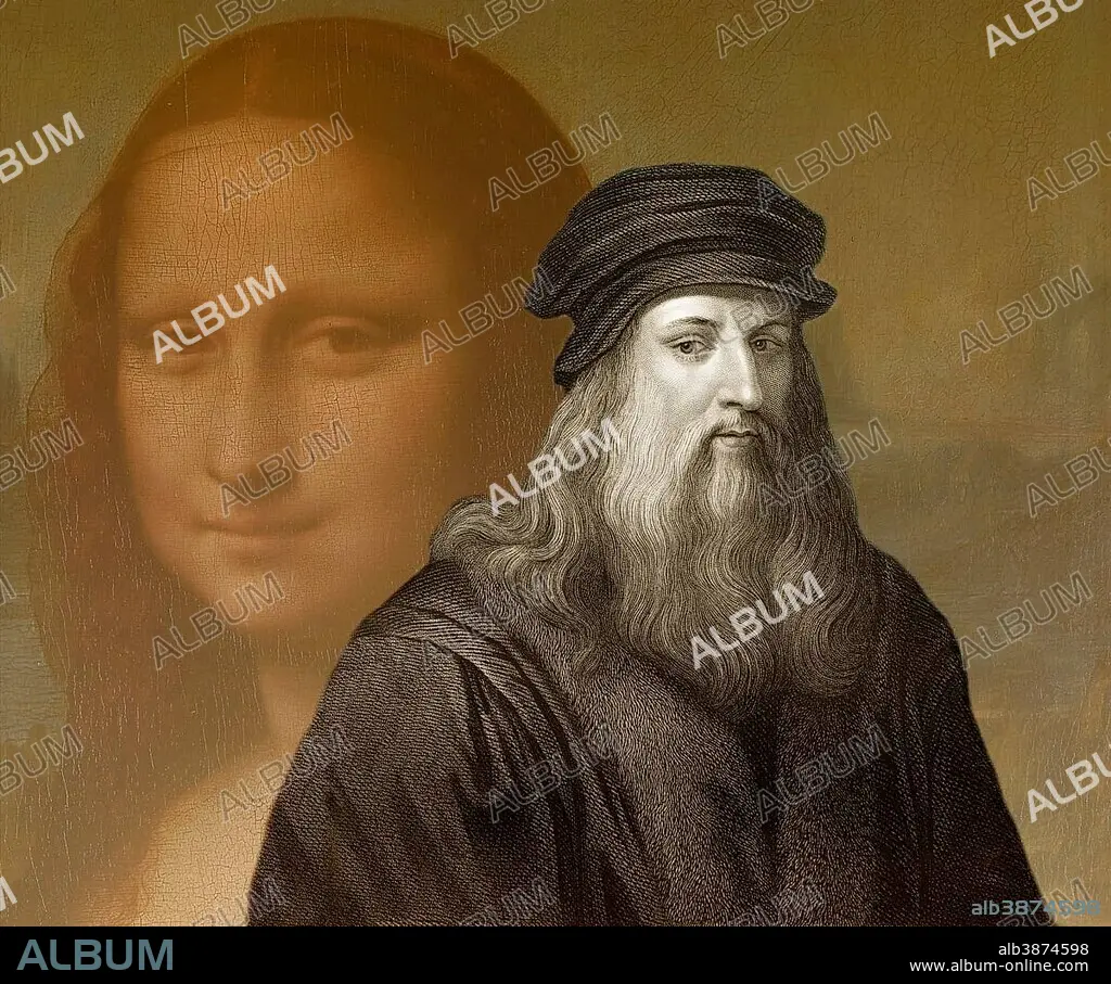 Caption: Painting Mona Lisa, in front Leonardo da Vinci, Italian painter, sculptor, architect, engineer, historical illustration