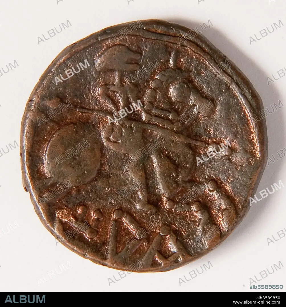 Caption: Roman coin, 1st century BC, in the Roman Villa of Torre Llauder or Can Llauder, Mataró, Barcelona, Catalonia, Spain