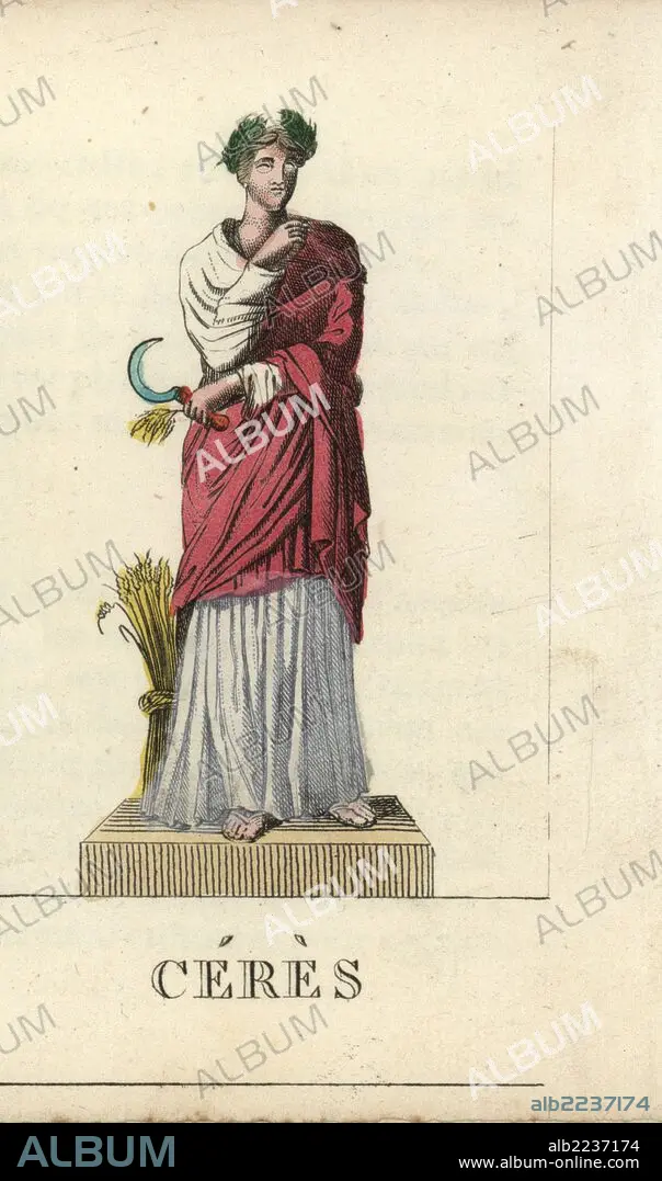 Ceres, Roman goddess of the harvest and agriculture, in toga and laurel crown, with scythe and bushel of wheat. Handcoloured copperplate engraving engraved by Jacques Louis Constant Lacerf after illustrations by Leonard Defraine from "La Mythologie en Estampes" (Mythology in Prints, or Figures of Fabled Gods), Chez P. Blanchard, Paris, c.1820.