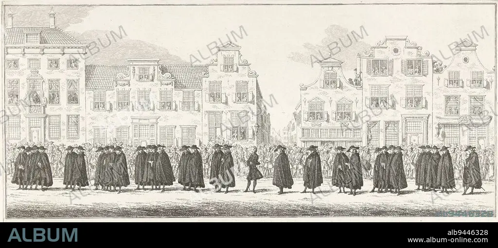 Members of the courtly administration in the funeral procession of Anna van Hannover at Delft, 1759, Simon Fokke, after Paulus Constantijn la Fargue, 1759 - 1761, Members of the States General and staff of the States of Holland. Part of a series of 16 plates in etching of the bierstatie of the princess Anna van Hannover, buried on February 23, 1759 in Delft., print maker: Simon Fokke, intermediary draughtsman: Paulus Constantijn la Fargue, Amsterdam, 1759 - 1761, paper, etching, h 190 mm × w 395 mm