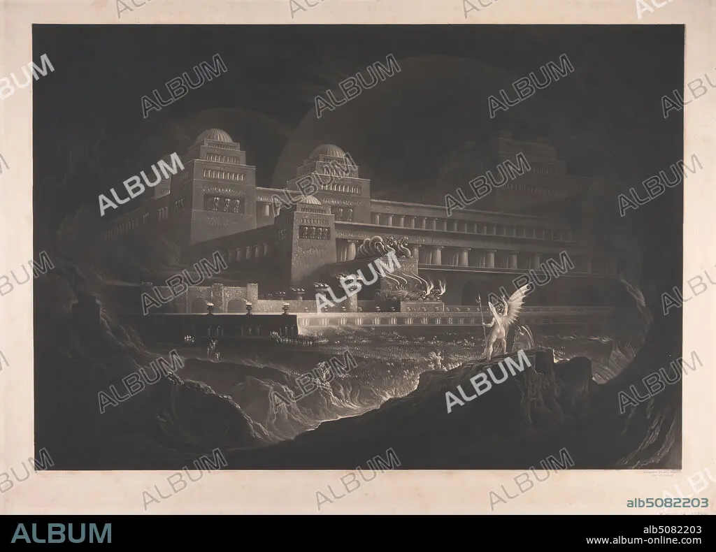 Caption: Pandemonium, Print made by John Martin, 17891854, British, and J. P. Quilley, active 1828, after John Martin, 17891854, British, 1831, Mezzotint on moderately thick, slightly textured, cream wove paper, Sheet: 22 3/8 × 30 3/4 inches (56.8 × 78.1 cm) and Image: 19 1/8 × 27 5/8 inches (48.6 × 70.2 cm), angel, building, chaos, city, cliff, crowd, demon, devil, dome, dragon, elephant (animal), flame, hell, literary theme, Paradise Lost (published 1667) by John Milton, pillar, religious and mythological subject, rock, shield, spear, statue, torch, wings