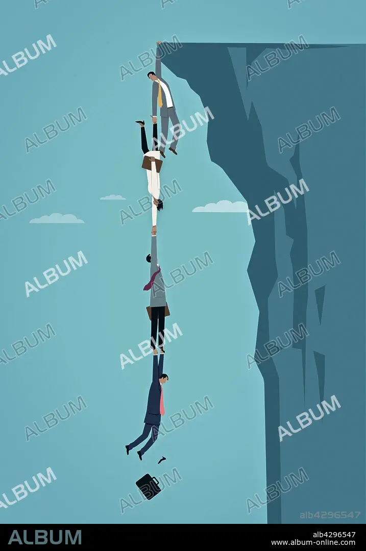 Business people dangling over edge of cliff holding on to each other in human chain.
