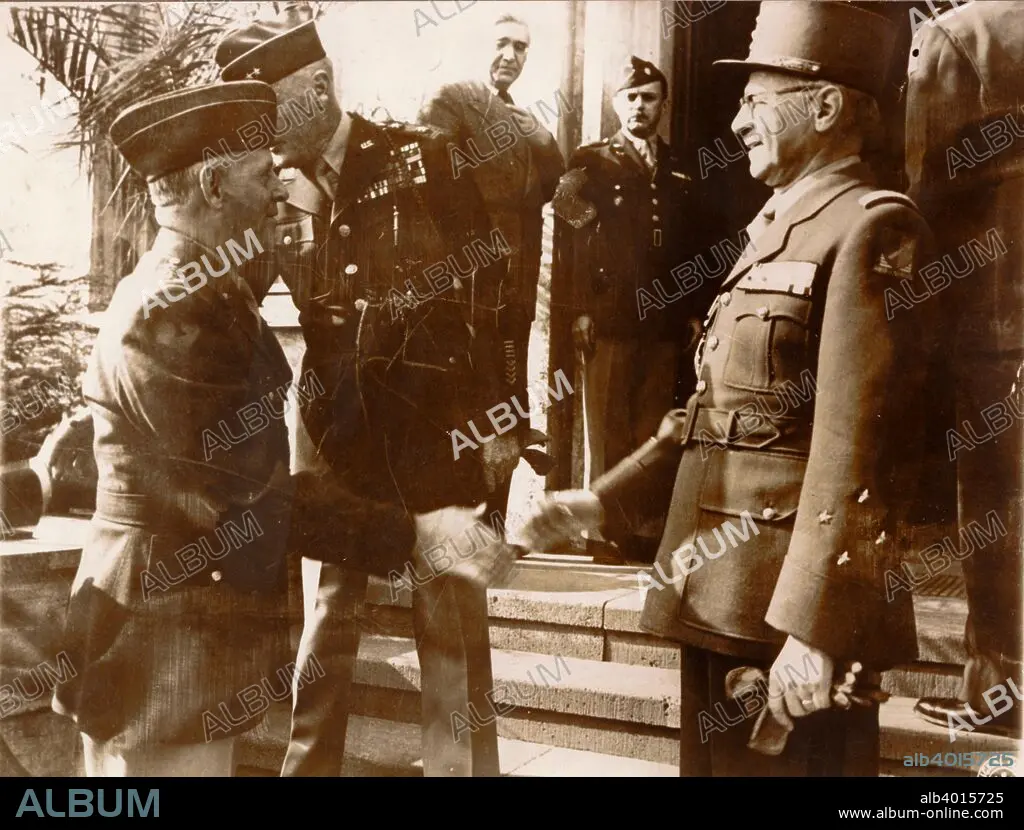 Caption: Unconditional surrender of the German armed forces, Rheims, France, World War II, 7 May 1945. French Major-General François Sevez (1891-1948), US Army General Walter Bedell Smith (1895-1961) and US Air Force General Carl Spaatz (1891-1974). The Soviet representative at the signing, Major-General Ivan Susloparov, did not have official authorisation from Moscow to sign the document and the Soviets insisted on a second signing, which took place in Berlin shortly before midnight the following day.