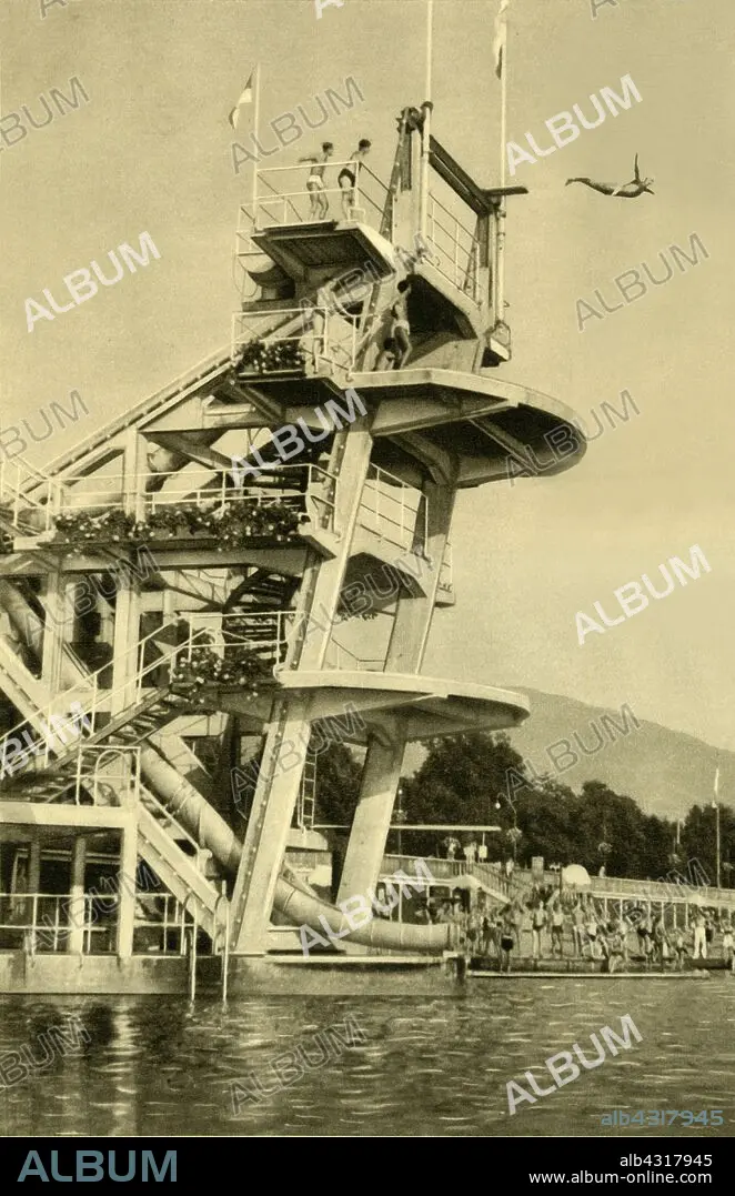 Diving platform, Millstatt, Carinthia, Austria, c1935. Holidaymakers at the health resort and spa town of Millstatt on the Millstätter See (Lake Millstatt), in the state of Carinthia. From "Österreich - Land Und Volk", (Austria, Land and People). [R. Lechner (Wilhelm Müller), Vienna, c1935]