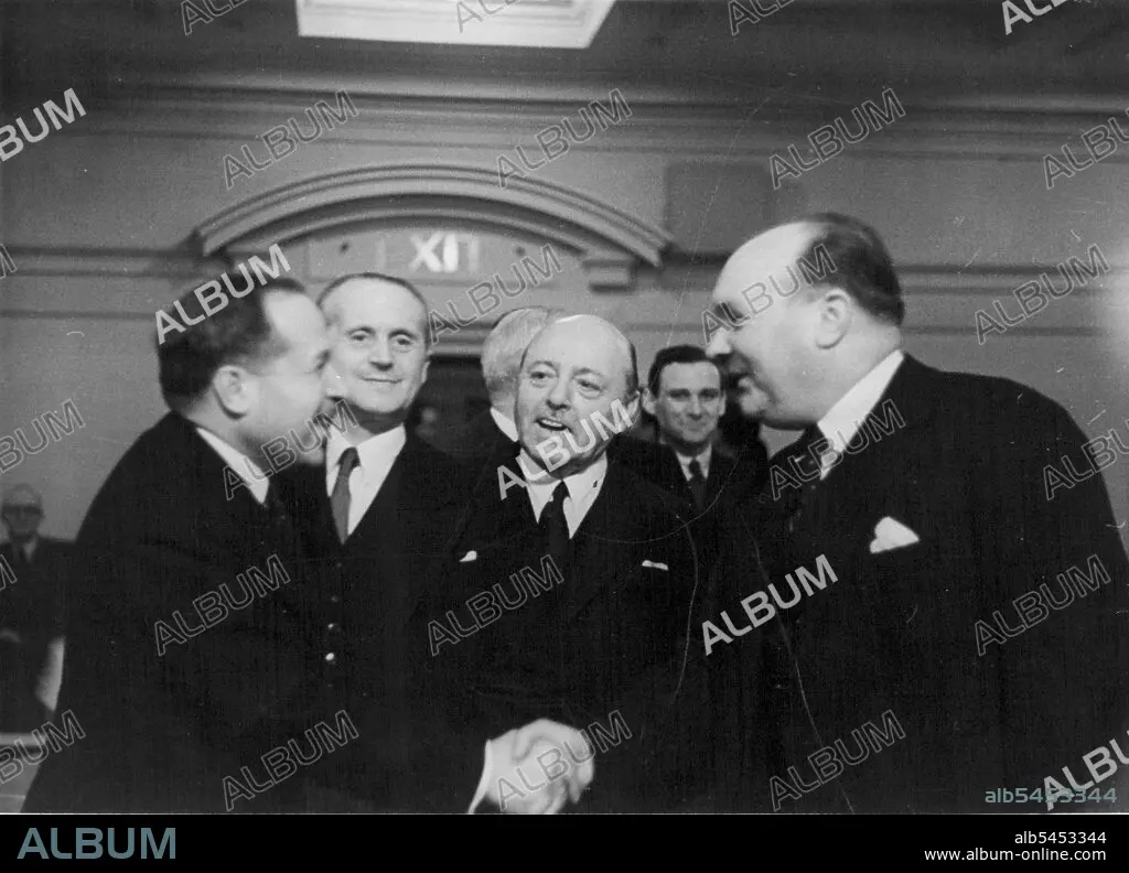 Caption: United Nations Assembly, London, 1946 -- M. Spaak, the Belgian Foreign Minister, was elected President of the Assembly. Here he is being congratulated by a colleague. March 24, 1948. (Photo by Pictorial Press).