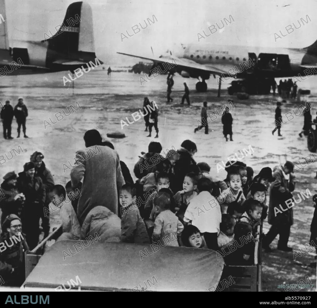 Mercy Airlift For Waifs -- A truckload of Korean children arrives at Kimpo Air Base in Seoul for evacuation to an island haven off South Korea during United Nations airlift of over 1,000 orphans from the northwest battlefront area. some of the 15 C-54 planes of the U.S Far East Air Force's Combat Cargo Command await their pathetic cargo in back round. February 10, 1951. (Photo by AP Wirephoto).