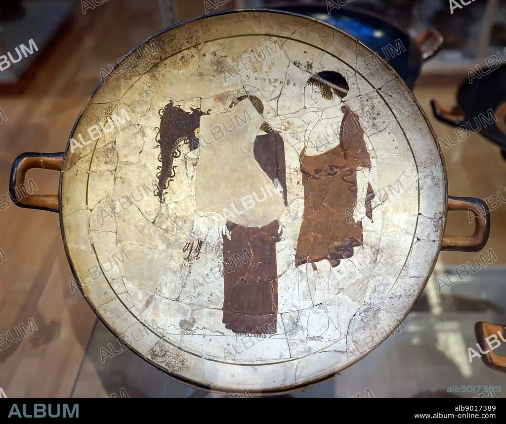 Caption: White ground pottery depicting Athena, Pandora and Hephaistos by a Tarquinia Painter. Dated 470 BC