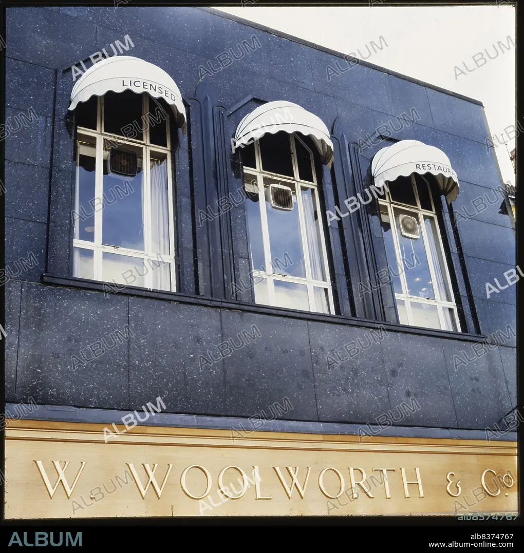 FW Woolworth and Co Ltd, 8-9 Bridge Street, Stratford-upon-Avon, Warwickshire, 1970s-1980s. The first floor windows and the granite facade of F W Woolworth & Co Ltd at 8-9 Bridge Street, originally built as a Burton store. The Burton store on Bridge Street was built in 1937; a foundation stone was laid by Raymond Montague Burton. Granite facades feature on around 15 Burton stores, including Stratford-upon-Avon, Kingston-upon-Hull, and Reading. The suppliers of the granite may have been Fenning & Co of Hammersmith.