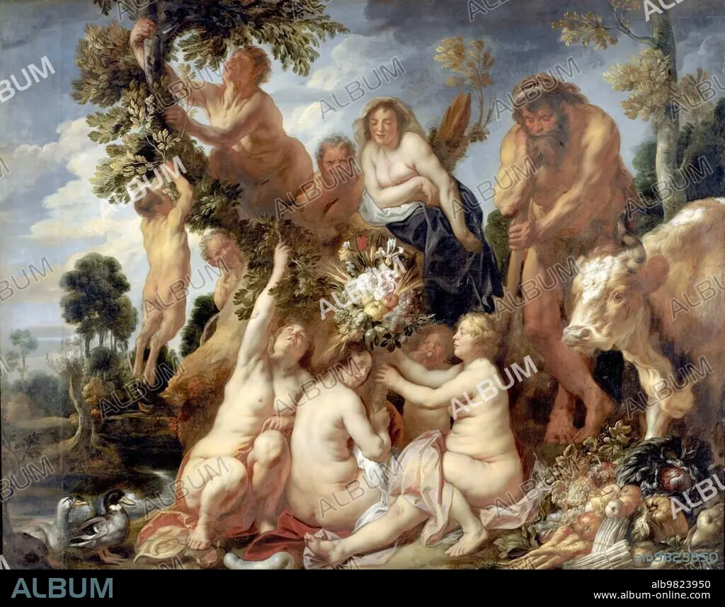 Caption: The Overcoming of Achelous by Hercules. The Origin of the Cornucopia; Allegory of Fertility; Painting by Jacob Jordaens; Historical; Digitally restored reproduction of a historical work of art