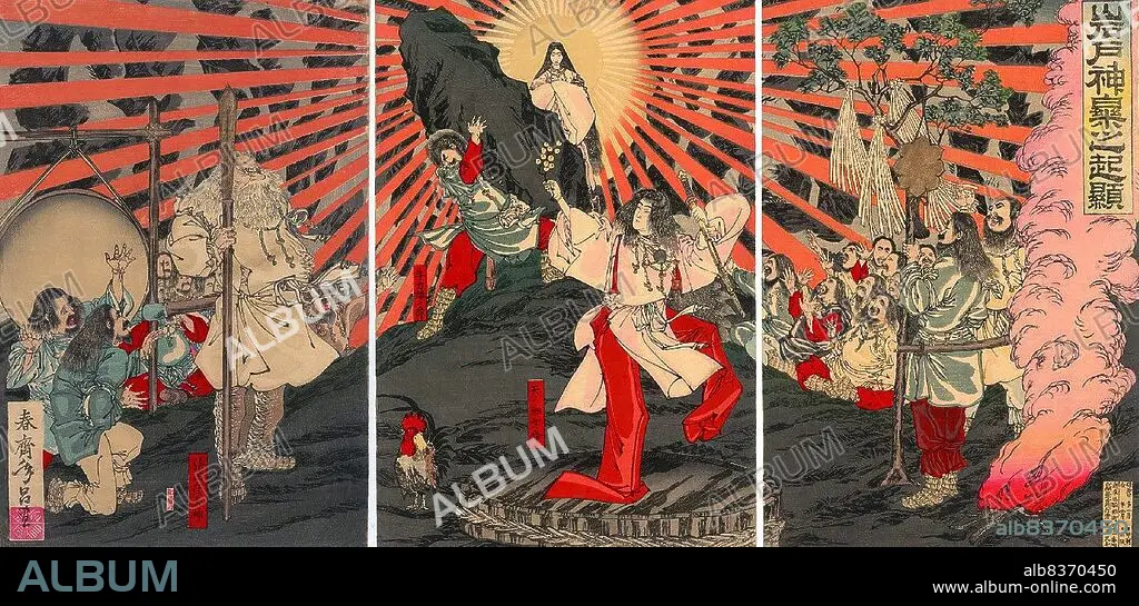 Title: Japan: Amaterasu and the 'Origin of Music and Dance at the Rock Door', Meiji Period triptych by Shunsai Toshimasa (1866-1913),1887
