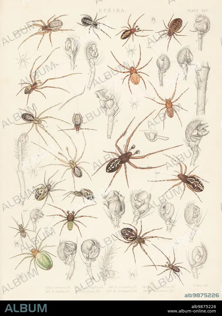 Caption: Missing sector orb weavers, Zygiella x-notata 244, Zygiella atrica 245, cricket-bat orbweaver, Mangora acalypha 246, cucumber green spider, Araniella cucurbitina 247, Cercidia prominens 248, strawberry spider, Araneus alsine 249, oak spider, Aculepeira ceropegia 250, and Neoscona adianta 251. Handcoloured lithograph by W. West from John Blackwalls A History of the Spiders of Great Britain and Ireland, Ray Society, London, 1861.