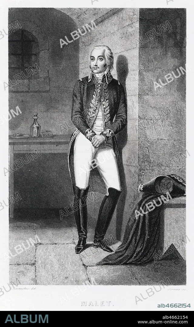 Le general Claude-Francois MALET (1754-1812) en prison apres son coup d'etat contre NAPOLEON 1er. Illustration de 1849 par Alexandre LACAUCHIE (1802-1881) pour Galerie historique de la Revolution francaise par Albert MAURIN (ne en 1802). Credit : Collection Jonas/Kharbine-Tapabor.