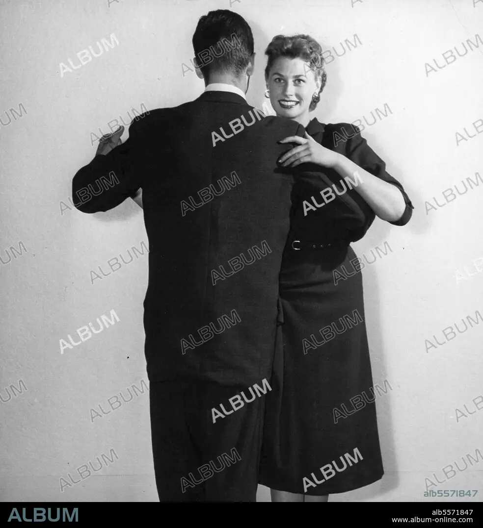 Caption: Side Or "Step Out" Position: Man fares in line of direction, girl faces backwards, her left hand on his right shoulder. His left hand clasps her right hand below shoulder level. Man's weight rests on right foot, girl's on her left. February 25, 1954.