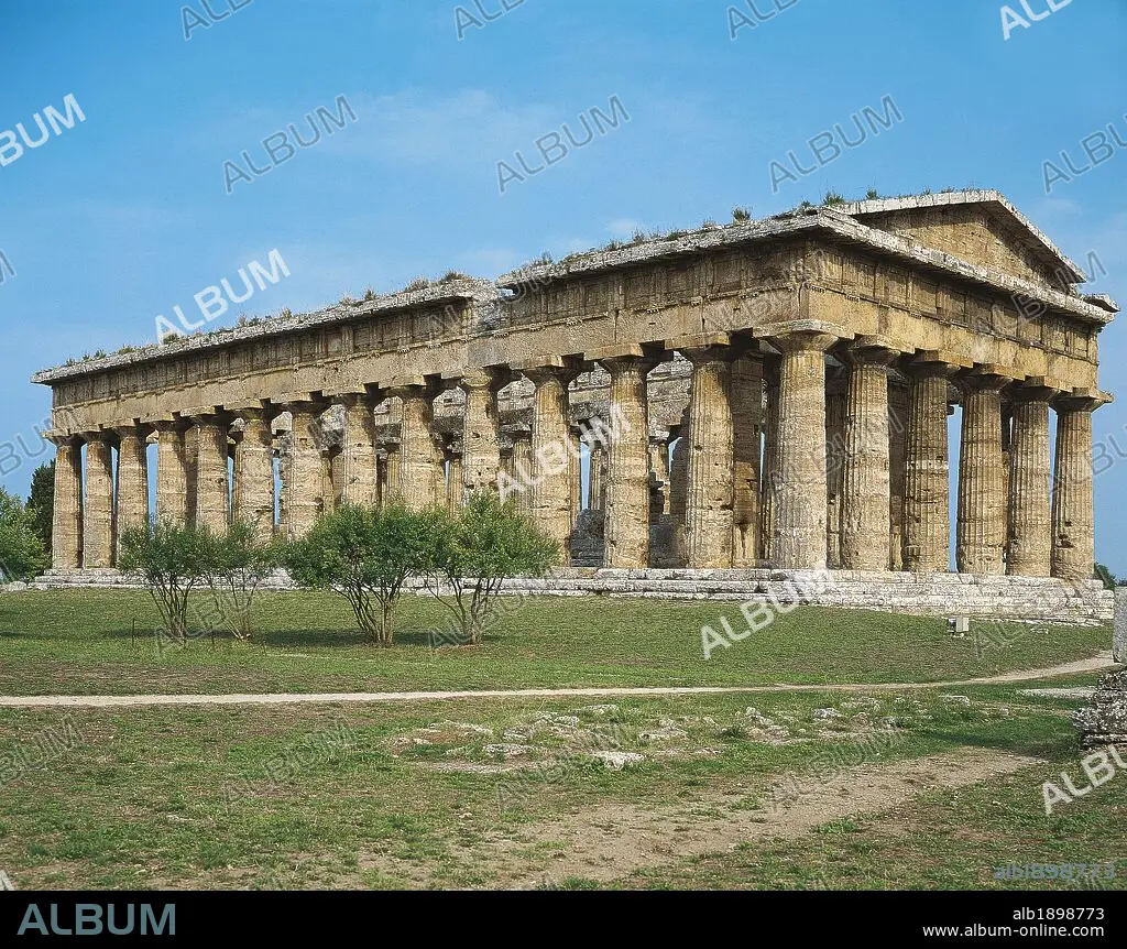 Caption: The Doric Temple of Neptune (or Poseidon), in Paestum (UNESCO World Heritage Site, 1998), Campania, Italy. Ancient Greek civilization, Magna Graecia, mid-5th Century BC.