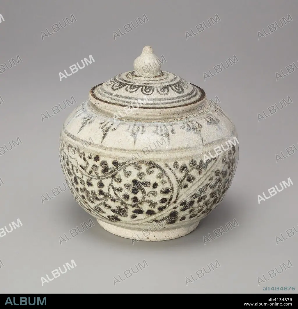 Caption: Sawankhalok Ware Covered Box with Lotus Bud Knob. Thailand, Sukhothai Province, Si Satchanalai. Date: 1301-1500. Dimensions: 12.8 × 12.4 × 12.4 cm ( 5 × 4 7/8 × 4 7/8 in. ). Glazed stoneware with iron-brown underglaze. Origin: Sawankhalok.