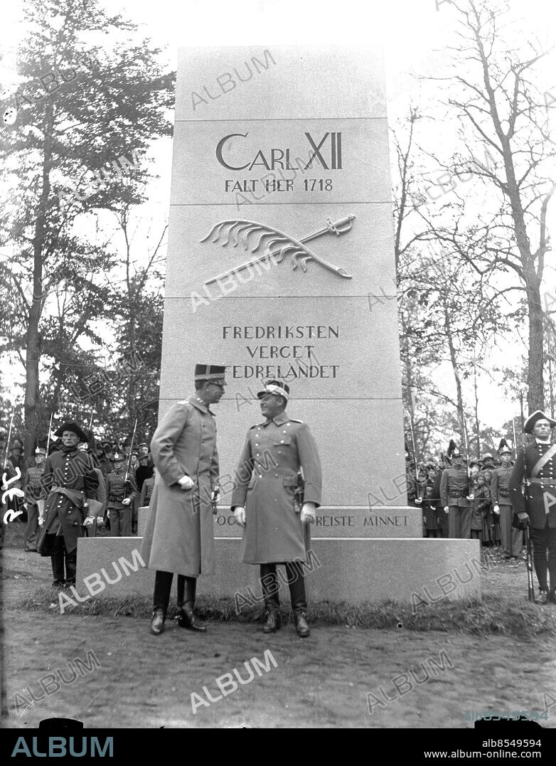 Halden - Norge - Fredrikstens fästning 1938-10-30 - Minnessten avtäcks? - Kronprinsarna Gustaf Adolf och Olav deltar i högtiden - *** Local Caption *** GT Låda 1983-oktober-01. KAMERAREPORTAGE.
