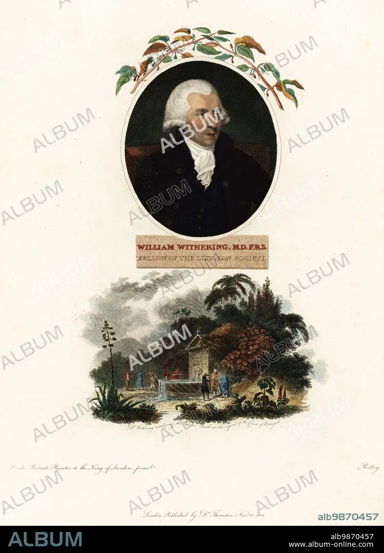 Caption: William Withering, MD, FRS, physician, geologist, chemist and botanist, Fellow of the Linnaean Society, 1741-1799. Handcoloured copperplate engraving by William Ridley after a portrait by Carl Fredrik von Breda. Dr Withering analysing the mineral content of the medicinal spa at Queen's Bath or Caldas da Rainha in Portugal, 1794. Handcoloured copperplate stipple engraving from Dr. Robert John Thorntons New Illustration of the Sexual System of Carolus von Linnaeus, the Temple of Flora, London, 1801.