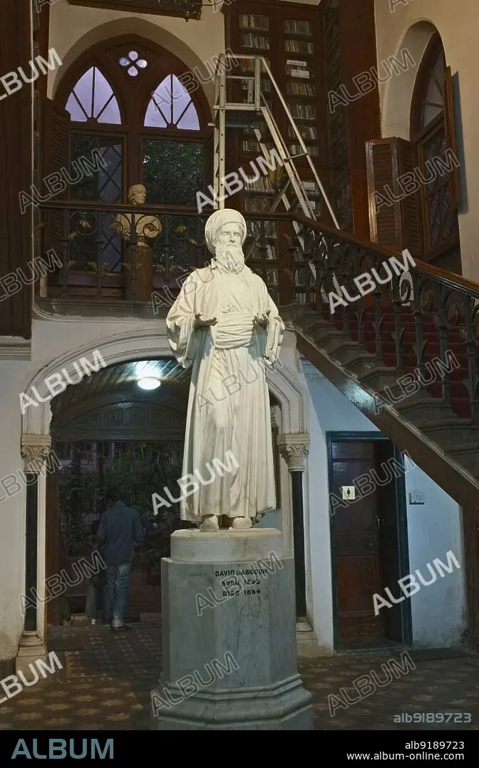 Caption: India: Statue of merchant and leader of the Jewish community in Bombay, David Sassoon (1792 - 1864), Sassoon Library, Kala Ghoda, Fort, Mumbai. Sassoon was born in Baghdad, where his father, Saleh Sassoon, was chief treasurer to the pashas (the governors of Baghdad) from 1781 to 1817, and leader of the city's Jewish community. Following the persecution of Baghdad's Jews by Daud Pasha, the family moved to Bombay via Persia. Sassoon was in business in Bombay no later than 1832, originally acting as a middleman between British textile firms and Gulf commodity merchants.