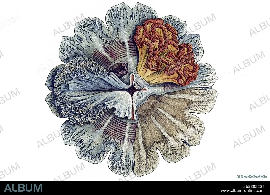 Caption: Historic illustration, tablet 8, title Discomedusae, Scyphozoa, Jellyfish, name Desmonema, 2/ Desmonema Annasethe, view from below after removal of appendages, Ernst Haeckel, Kunstformen der Natur, "Artforms of Nature"