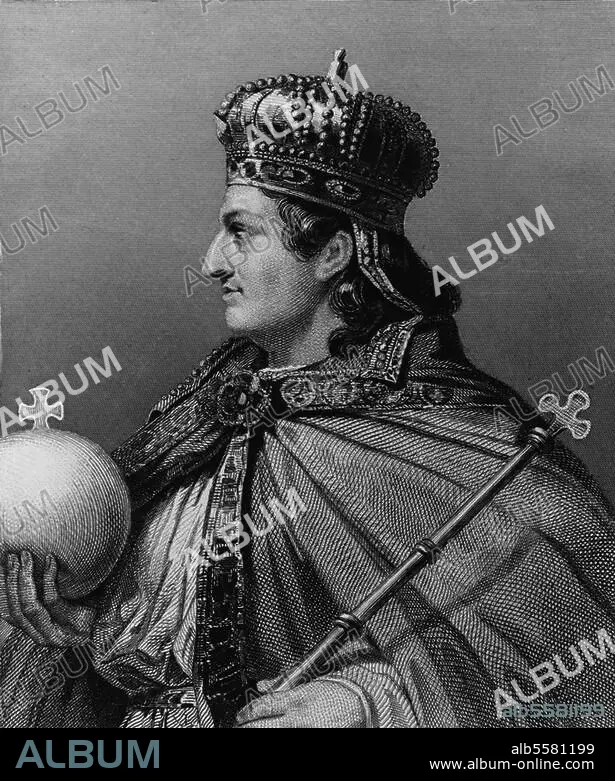 Caption: Lothair I, Holy Roman Emperor (840-55), eldest son of Louis the Pious; 795 - Prüm. 29.9.855. Portrait. Steel engraving, 1845, by Delannoy after a painting c. 1837, by Raymond-Quinsac Monvoisin (1794-1870). From: Ch. Gavard, Galeries Historiques de Versailles. Color.