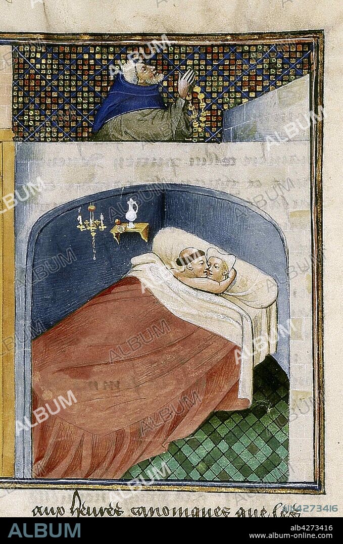 ANONYMOUS. The monk sleeps with the wife while the husband is praying. Miniature from Le livre appellé Decameron by Giovanni Boccaccio.