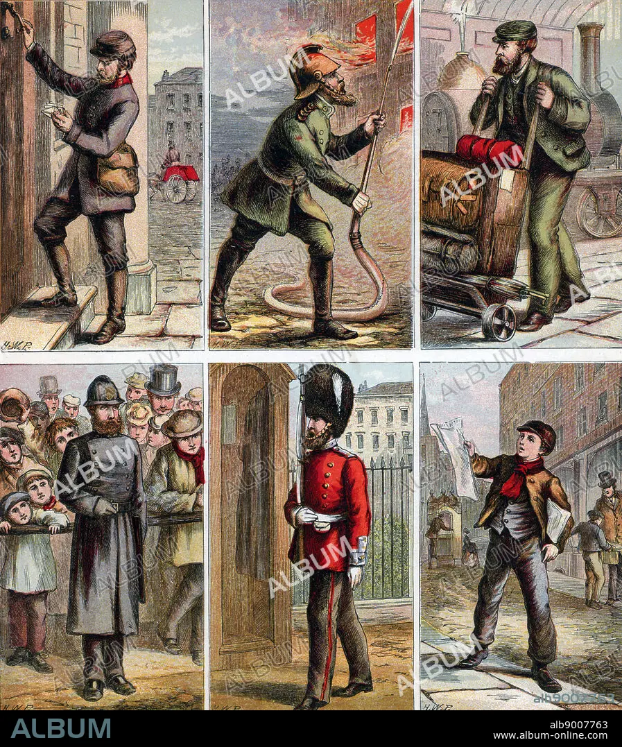 Caption: London street scenes. Postman delivering letters: Fireman fighting a fire: Railway Porter with trolley of luggage: Policeman on crowd duty: Guardsman of sentry duty: Newsboy selling papers. Illustrations by Horace William Petherick (1839-1919) for a children's book published London c1875.