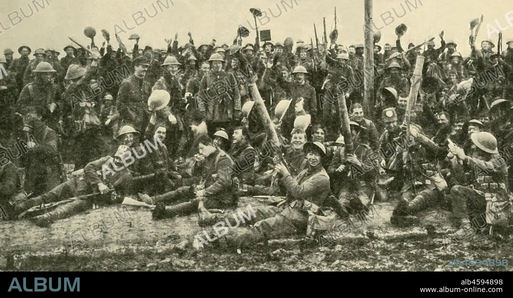 Caption: British soldiers after the Battle of St Eloi, Flanders, First World War, 27 March 1916, (c1920). 'Happy Warriors: officers and men of the Northumberland Fusiliers - the "Fighting Fifth" - photographed with their trophies immediately after their successful advance'. The 9th Brigade, including 1st Battalion The Northumberland Fusiliers, attacked heavily defended positions around St Eloi, three miles south of Ypres. From "The Great World War: A History", Volume V, edited by Frank A Mumby. [The Gresham Publishing Company Ltd, London, c1920]