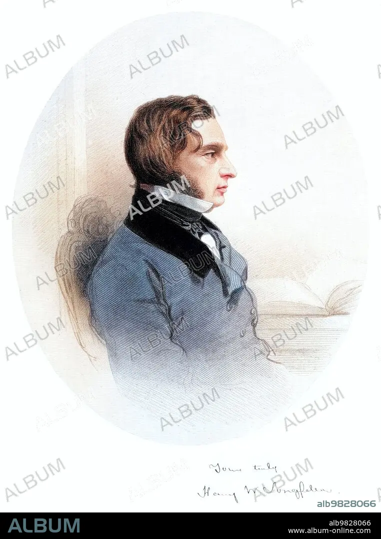 Caption: Henry Wadsworth Longfellow (February 27, 1807 - March 24, 1882) was an American poet and educator. He wrote many lyric poems known for their musicality and often presenting stories of mythology and legend. He became the most popular American poet of his day and also had success overseas. His first major poetry collections were Voices of the Night (1839) and Ballads and Other Poems (1841). His most famous works are: Paul Revere's Ride, The Song of Hiawatha, and Evangeline. He was the first American to translate Dante Alighieri's The Divine Comedy, and was one of the five Fireside Poets. Engraving by W. H. Mote, 1851 (cropped and cleaned).