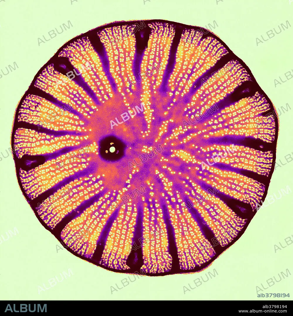 Caption: Colour enhanced transmission electron micrograph of diatom species Cyclotella meneghiniana Kutzing. Magnification: 15,000x @ 8x10(inches).