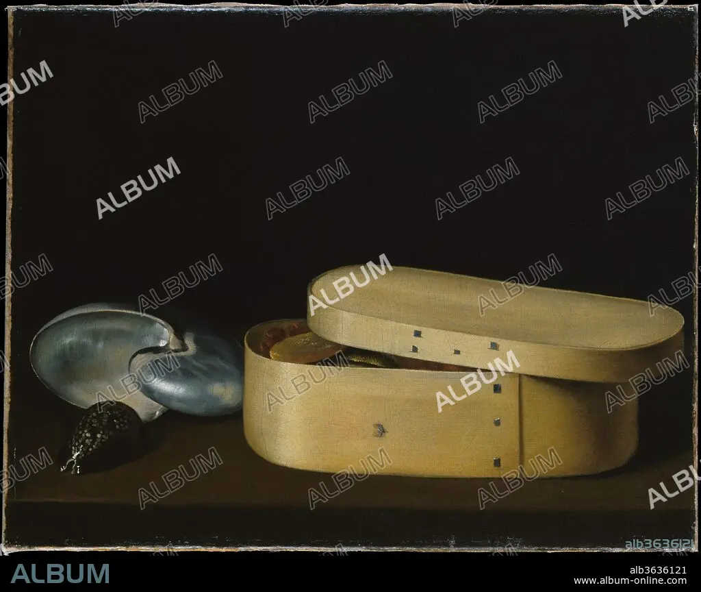 A French-speaking Lutheran from Strasbourg, Stoskopff worked intermittently in Paris from 1622 to 1641. This spare picture of carefully arranged exotic shells and a simple box filled with fish and candied fruits is a characteristic essay in subtle shapes and tones.