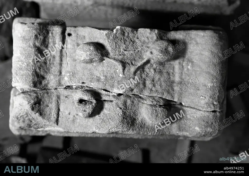 Caption: Altar with niche. Sandstone. Nehalennia sitting, with a basket of fruit on either side. Right and left: horn of plenty. Back: curtain. On top: 2 apples at the back, 2 pears at the front. Restored from 3 parts., Altar, stone, sandstone, 78 x 42.5 x 23 cm, 163 kg, roman 150-250, the Netherlands, Zeeland, Noord-Beveland, Colijnsplaat, Oosterschelde