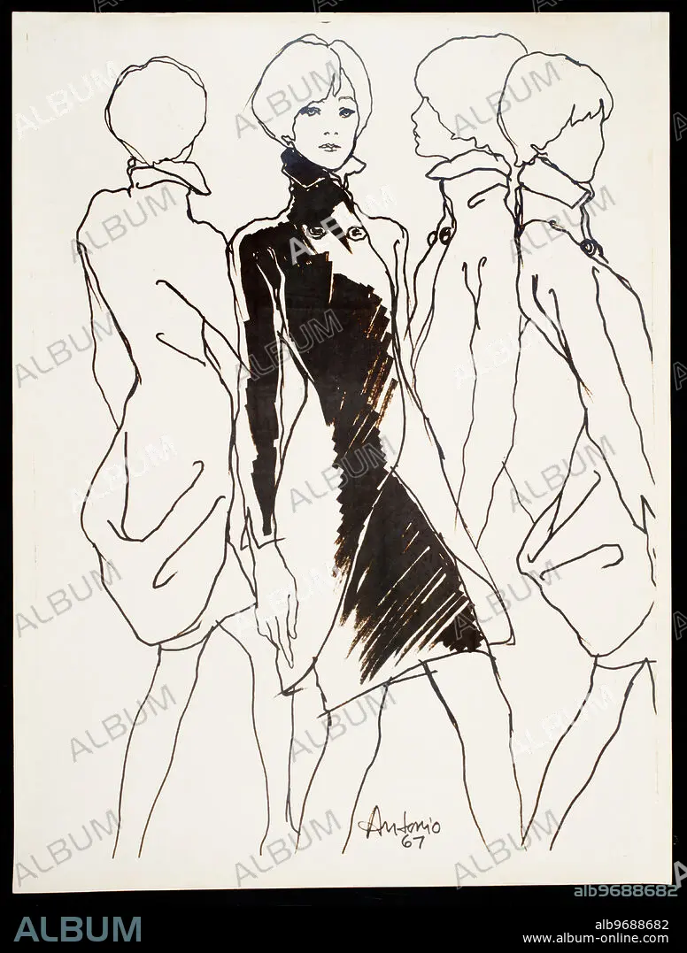 Caption: Costume design drawing of wrap coat with two button neckline closure, three quarter length sleeves, and standing pointed collar. Fashion design by Charles James. Illustration by Antonio Lopez.