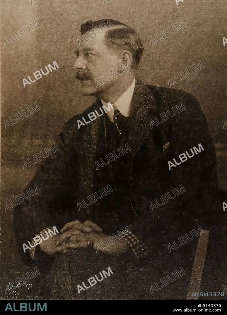 Caption: Rudolph Dührkoop, Peter Behrens, paper, platinum printing, image size: height: 21.00 cm; width: 15.80 cm, dry stamp: recto and left: Dührkoop, 1908, stamp: verso and on the cardboard: inventory stamp of the State Picture Office Hamburg, inscribed and dated: recto and re on the cardboard handwritten in lead: R. DÜHRKOOP; verso and handwritten in lead: Maße, Professor Peter Behrens, April 1908, portrait photography, half-figure portrait, architect, artist, man, sitting figure, Peter Behrens