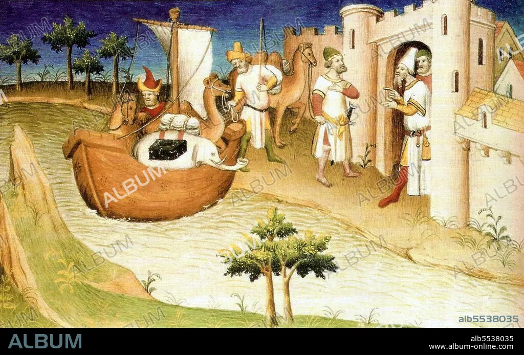 Title: Italy / China: Marco Polo (c.1254—1324) travelling by boat with an elephant and a camel. Le Livre des Merveilles< / i>, early 15th century.
