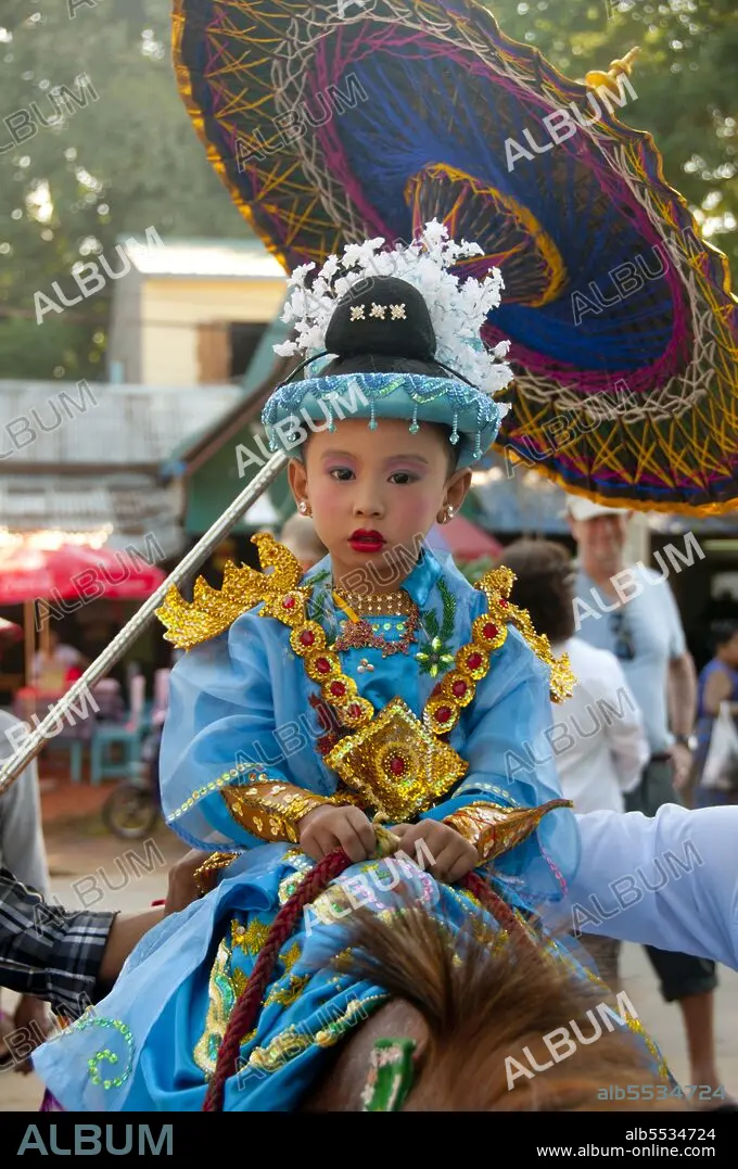 Title: Burma / Myanmar: Young boy riding a horse and dressed in fine silks to symbolise Prince Siddhartha Gautama's departure from the royal palace. Shinbyu or Buddhist novitiation ceremony for young Burmese boys, Bagan (Pagan) Ancient City